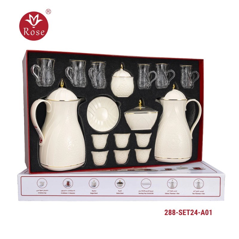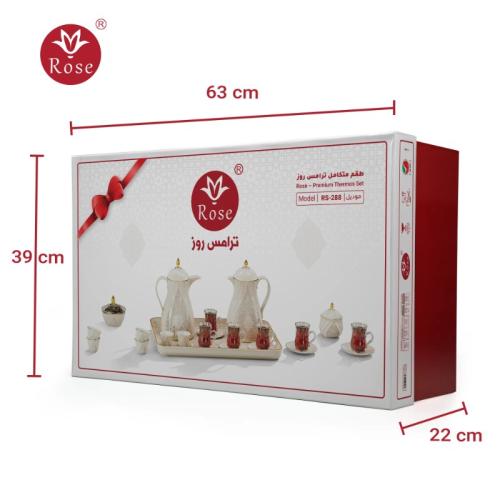Rose Thermos Complete Set Model: 624-SET24 in a luxurious box containing: Tea Thermos 1-Litre + Coffee Thermos 1-Litre + 6-piece Coffee Cup + 6 Istkana Cup + 6 Saucers + Dates Bowl + Serving Tray 53*35.