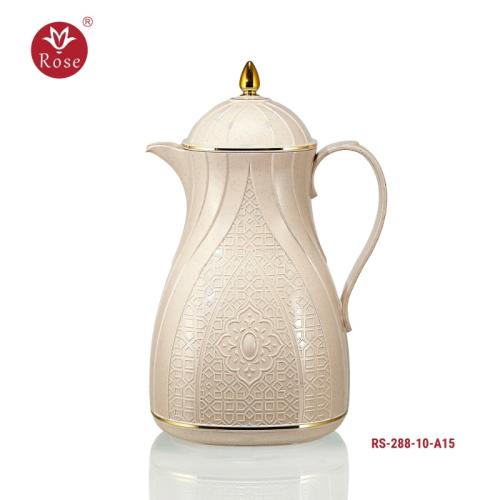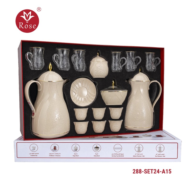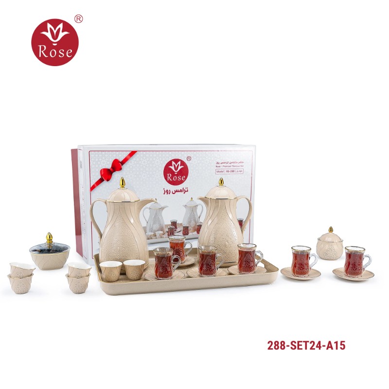 Rose Thermos Complete Set Model: 288-SET24 in a luxurious box containing: Tea Thermos 1-Litre + Coffee Thermos 1-Litre + 6-piece Coffee Cup + 6 Istkana Cup + 6 Saucers + Dates Bowl + Serving Tray 53*35.
