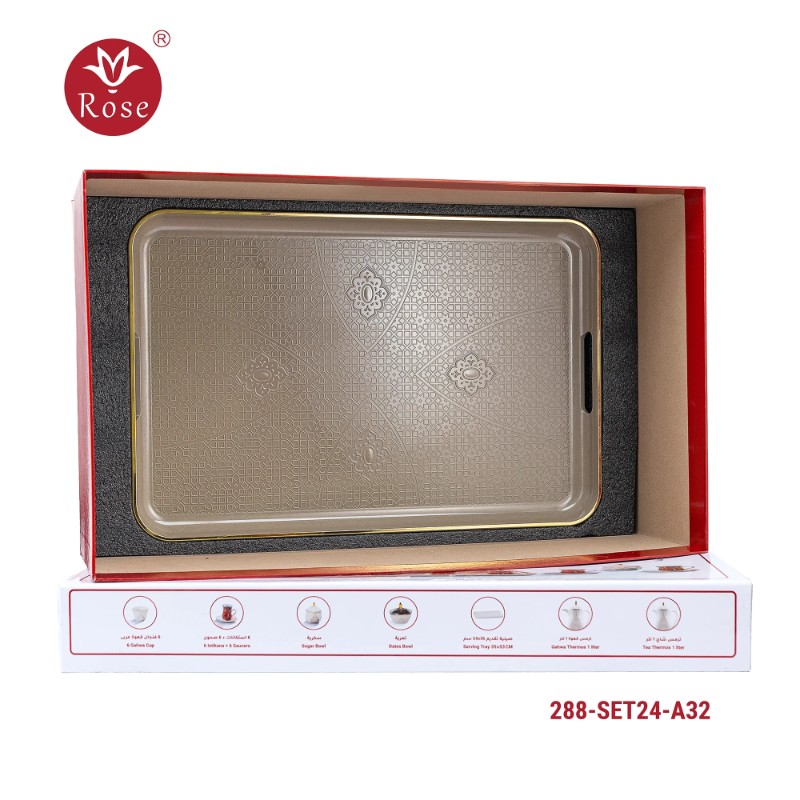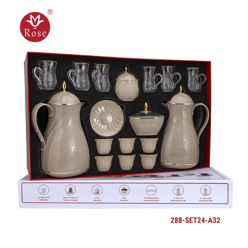 Rose Thermos Complete Set Model: 288-SET24 in a luxurious box containing: Tea Thermos 1-Litre + Coffee Thermos 1-Litre + 6-piece Coffee Cup + 6 Istkana Cup + 6 Saucers + Dates Bowl + Serving Tray 53*35.