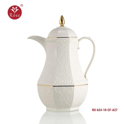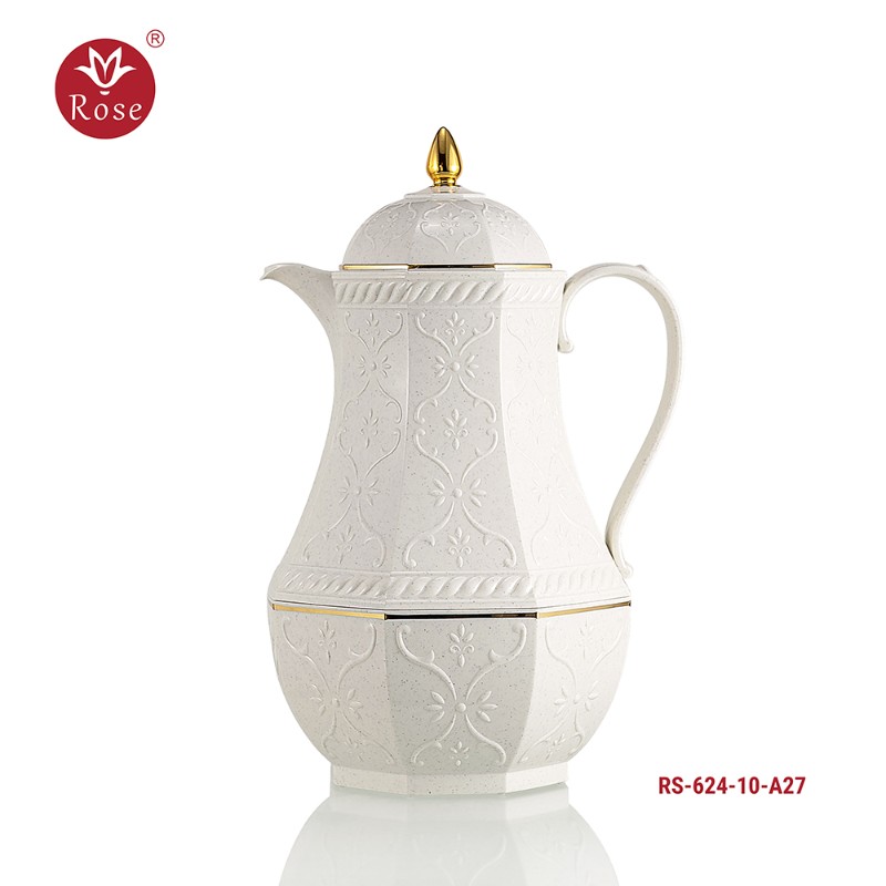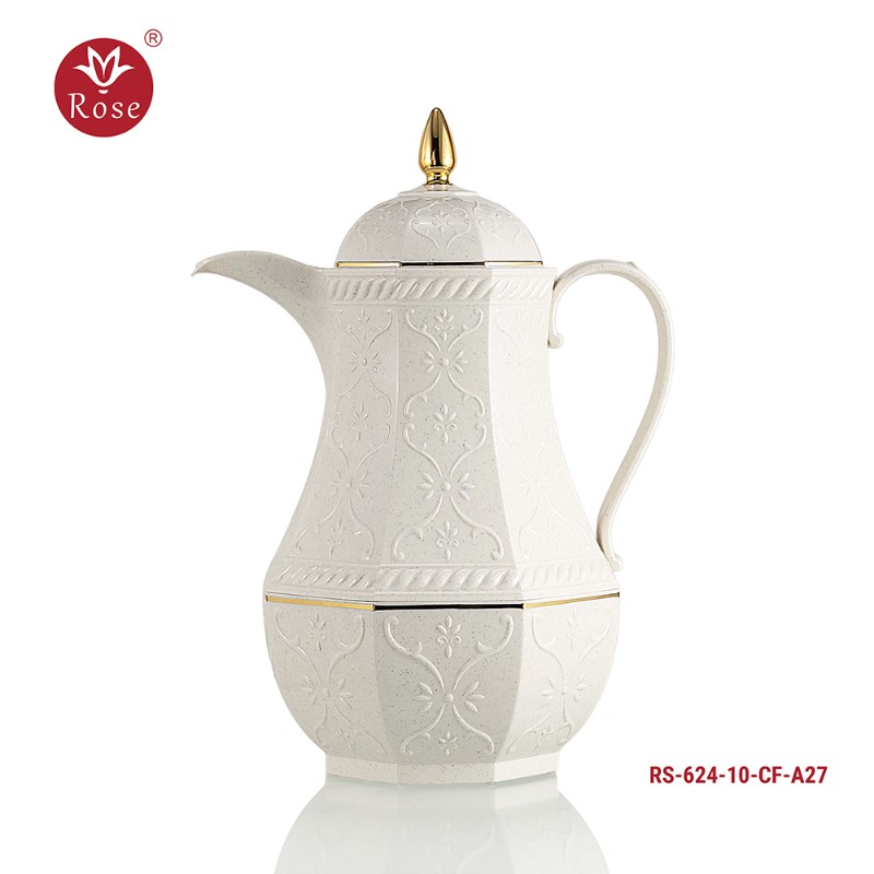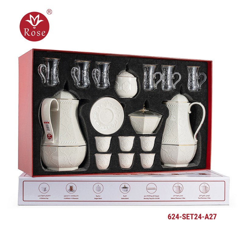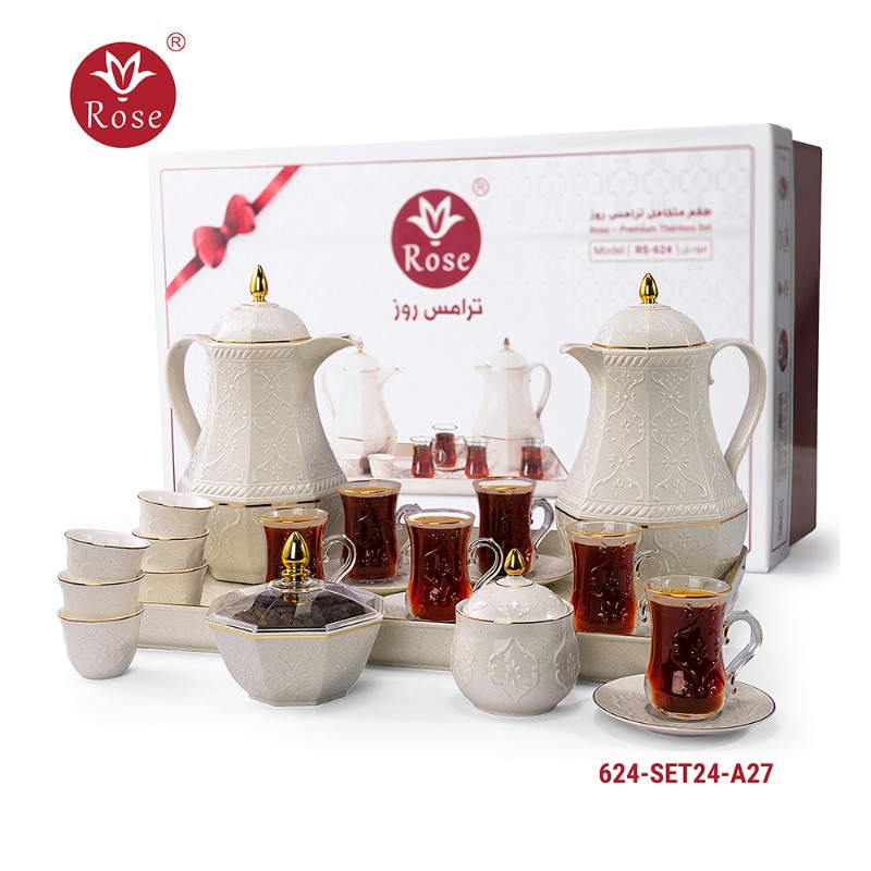 Rose Thermos Complete Set Model: 624-SET24 in a luxurious box containing: Tea Thermos 1-Litre + Coffee Thermos 1-Litre + 6-piece Coffee Cup + 6 Istkana Cup + 6 Saucers + Dates Bowl + Serving Tray 53*35.